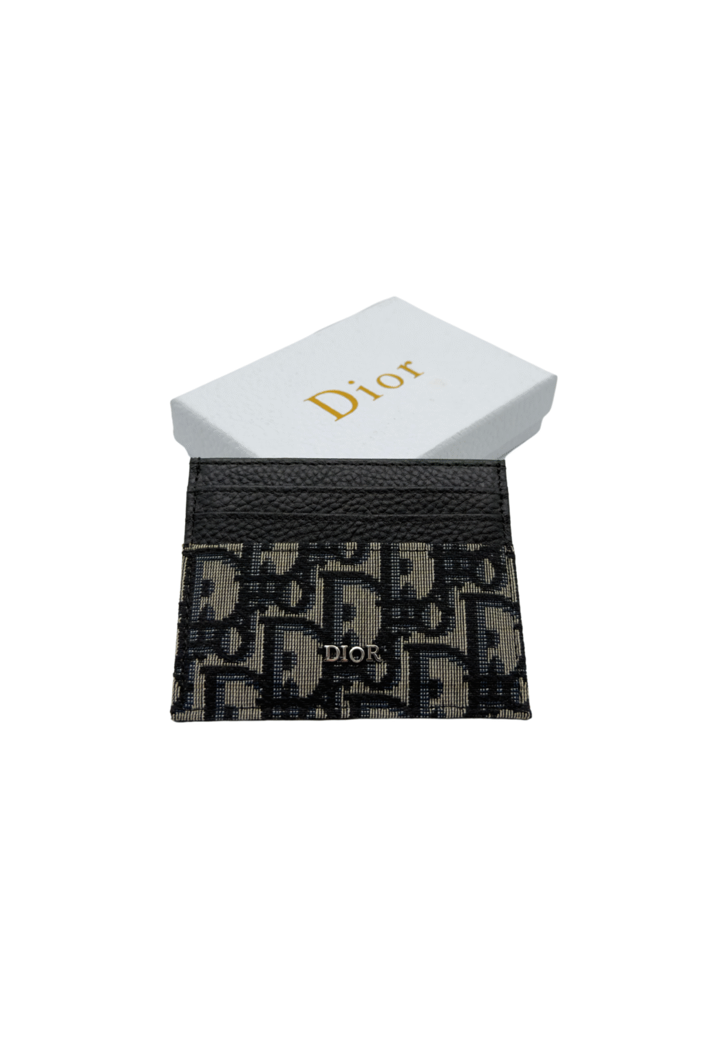 • Design (Pattern): The card holder is decorated with the beige and black/navy Dior Oblique monogram pattern, which is the signature repetitive motif of the brand.